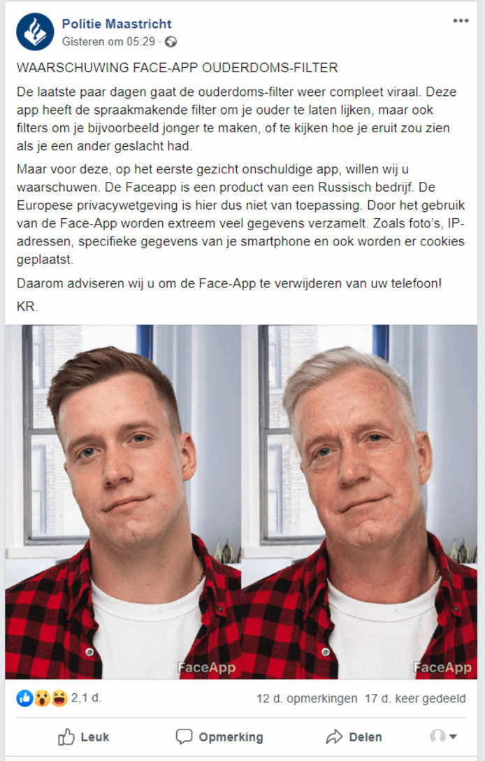 شارك العديد من قوات الشرطة في هولندا اليوم تحذير على وسائل التواصل الاجتماعية من تطبيق FaceApp ذي الشعبية الكبيرة.